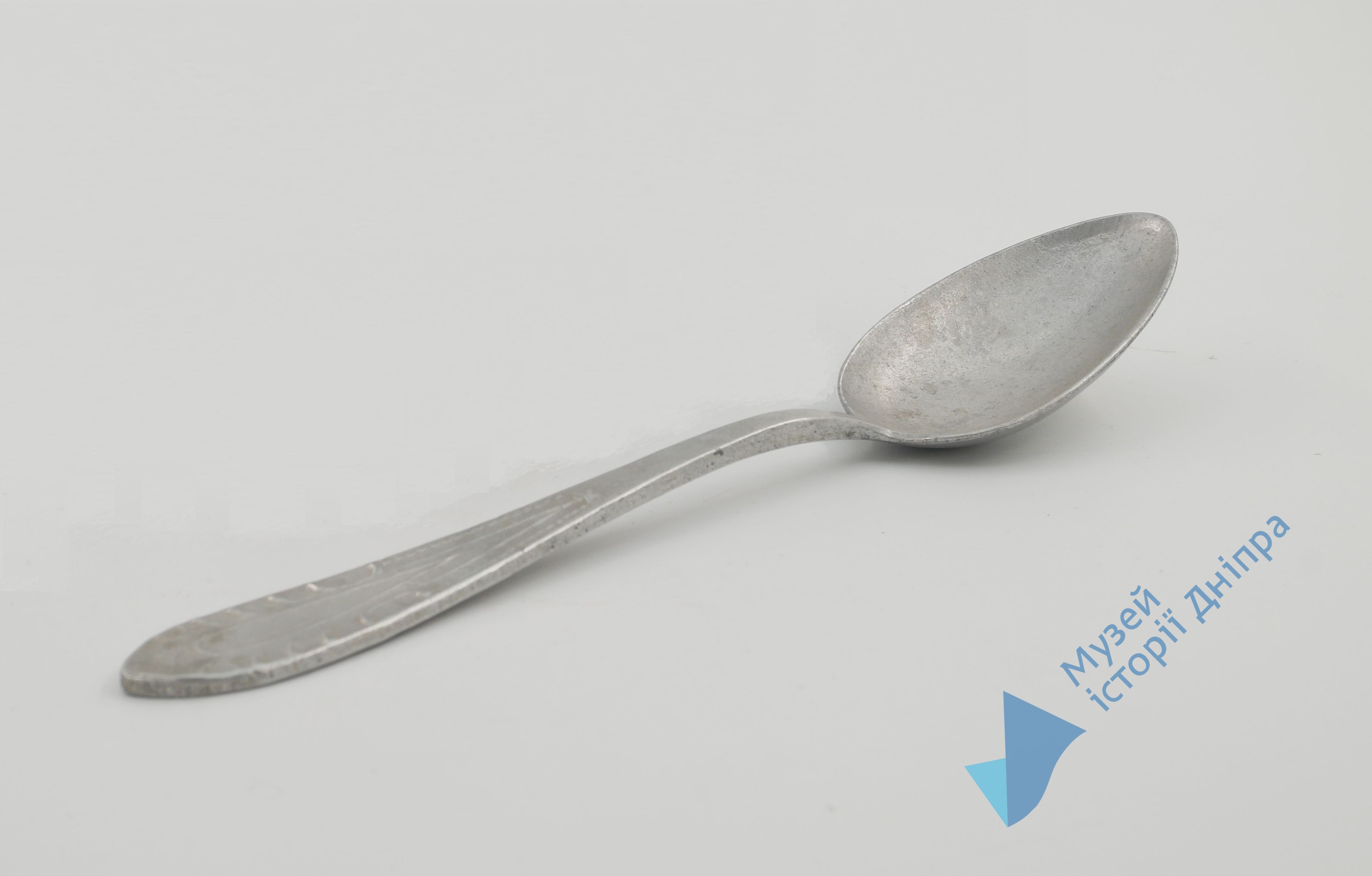 Світло срібного кольору. Ручка розширена – каплеподібної видовженої форми. Має орнамент геометричний, на зворотній стороні напис про виробника