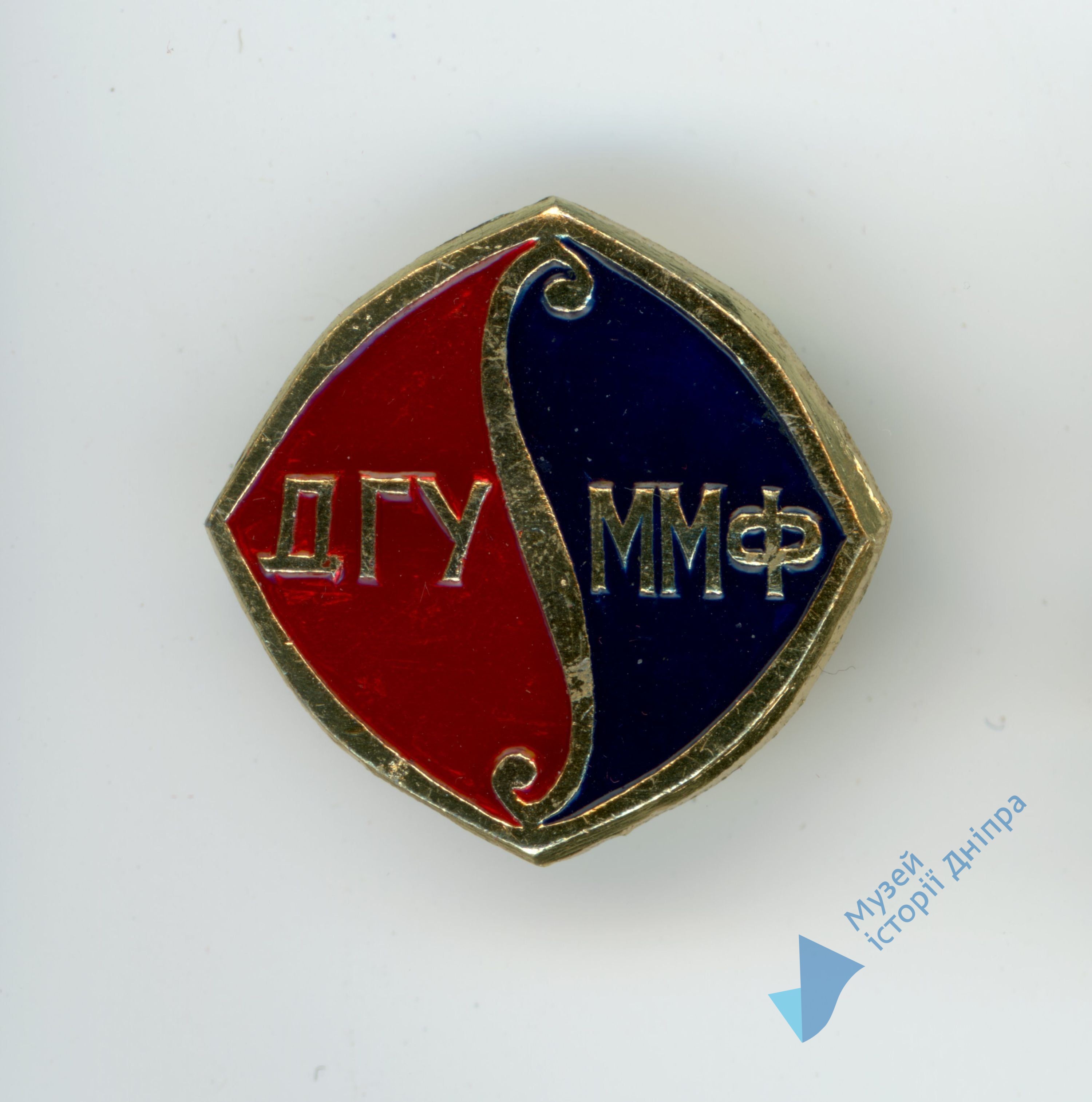 Ромбовидної форми з золотистою оконтовкою, розділений на 2 половини золотистим завитком. Ліва частина вкрита емаллю червоного кольору з золотістими літерами "ДГУ" (Дніпропетровський державний університет). Права астина вкрита емаллю чорного кольору з золотістими літерами "ММФ" (Механіко-математичний факультет) На зворотній стороні шпилькове кріплення