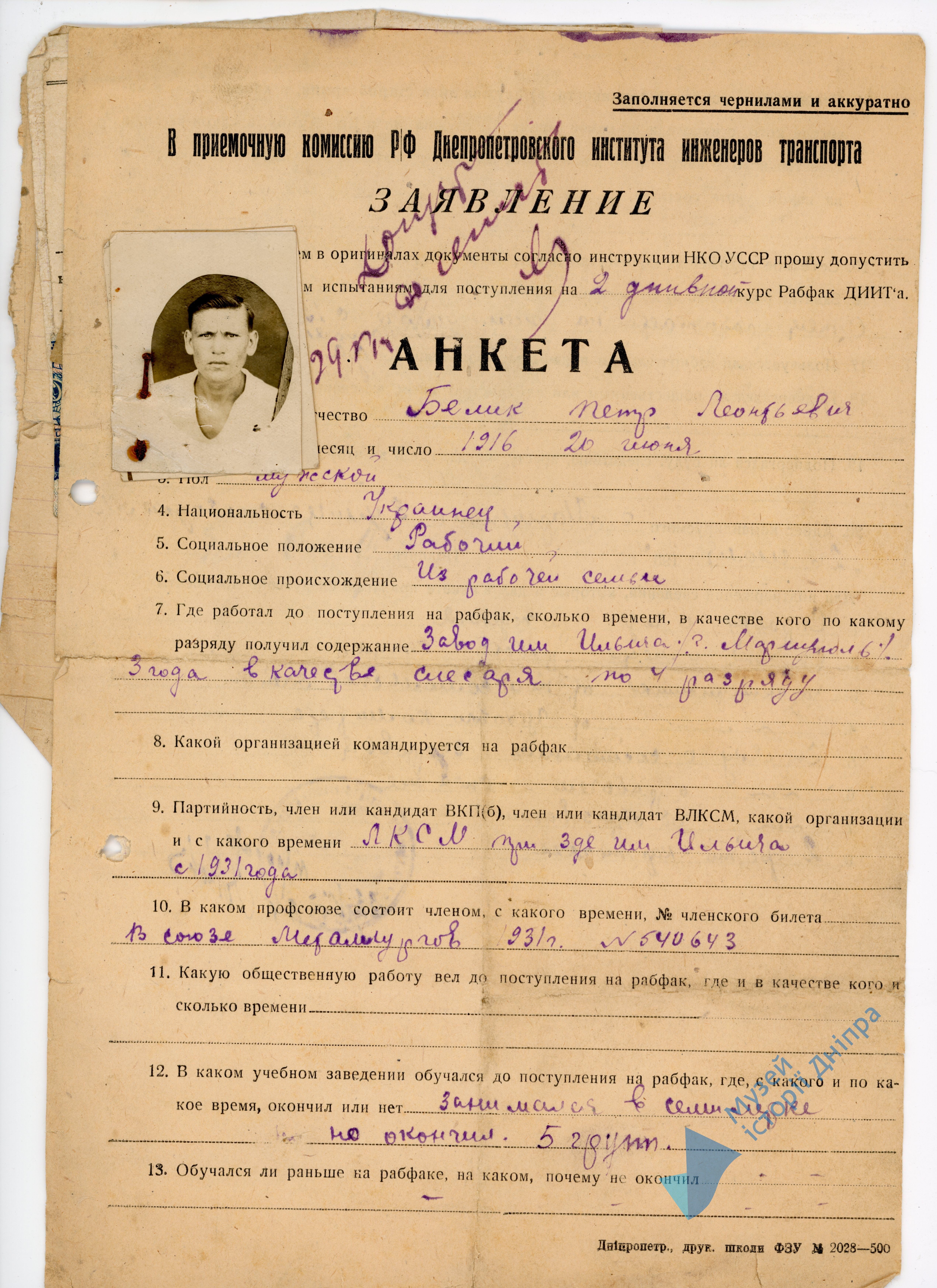 Комплекс документів до приймальної комісії Дііту: 1. Анкета до приймальної комісії Р/ф (Рабфак) Дніпропетровського Інституту Інженерів Транспорту 2. Довідка про народження 3. Довідку про місце роботи батька. 4. Характеристика від Ком. комсомольской ячейки. 5. Характеристика від цехового колеги 6. Заява про надання довідкі про стан здоров'я. 7. Довідка про робочий стаж 8. Довідка про освіту 9. 2 фотокартки. 8 аркушів паперу з друкованим та рукописним текстом, російською мовою, підписами, печатками; 2 фотокартки
