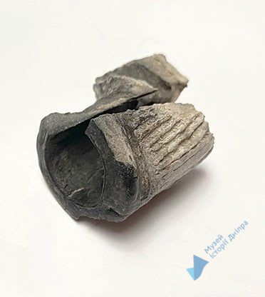 Уламок сіроглиняної люльки, обпалена. Чашечка циліндричної форми з широким пружком та прикрашена канелюрами.